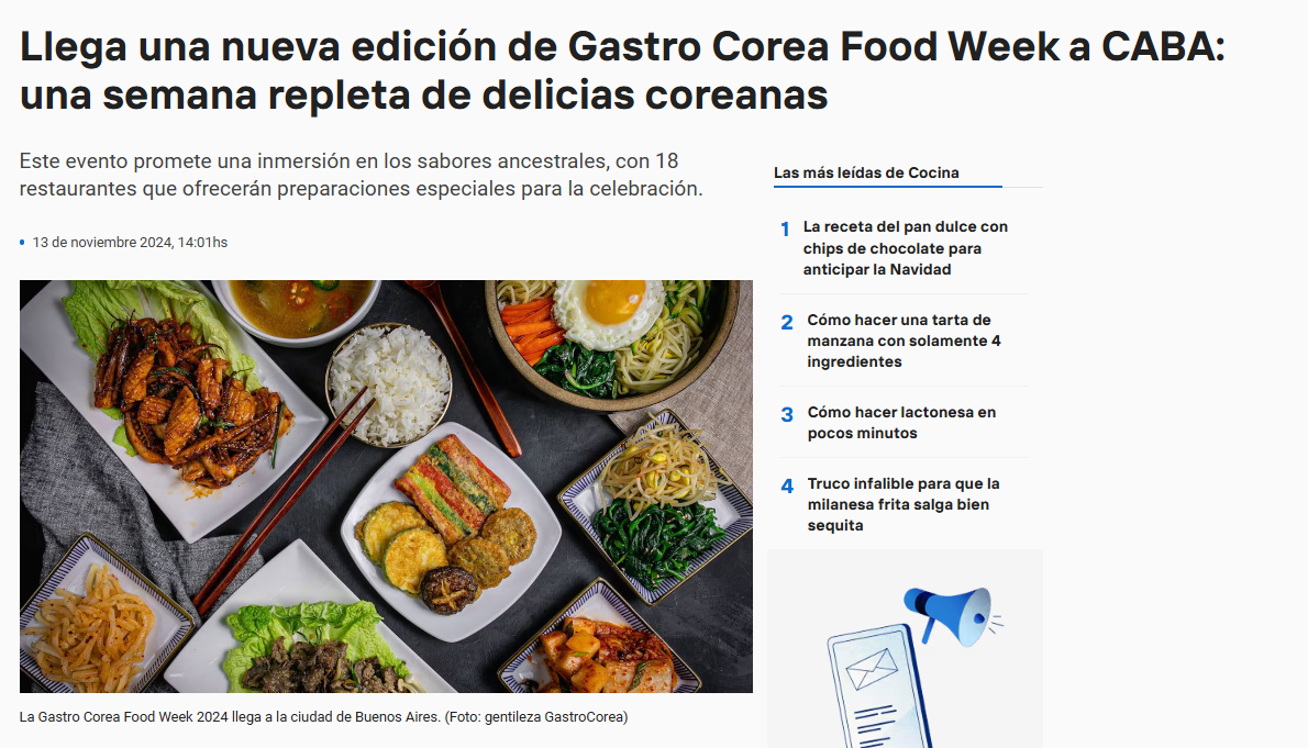 La Gastro Corea Food Week 2024 se desarrollará del 18 al 24 de noviembre en la ciudad de Buenos Aires. Se trata de una celebración culinaria que reúne a los mejores restaurantes y pastelerías coreanas porteñas para ofrecerle a los visitantes preparaciones diseñadas con ingredientes milenarios típicos de la gastronomía del país asiático.