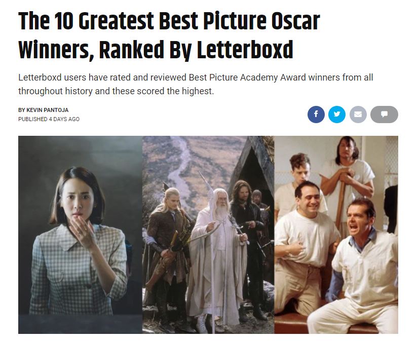 Screen Rant publicó el 12 de junio una lista de los "10 mejores ganadores del Óscar a la Mejor película" utilizando las puntuaciones medias basadas en las calificaciones de los usuarios en Letterboxd. En la lista, "Parásitos" del director Bong Joon-ho ocupó el primer lugar.