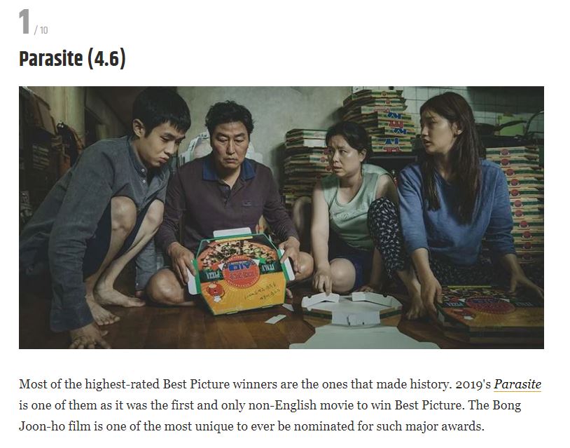 "La mayoría de las películas ganadoras al Óscar a la Mejor Película son aquellas que han logrado hacer historia. Parásitos (2019) es una de ellas, ya que es la primera y única película de habla no inglesa en ganar el Óscar a la Mejor Película", escribió el sitio. "La película de Bong Joon-ho es una de las más singulares jamás nominadas a premios tan importantes", agregó el sitio web.