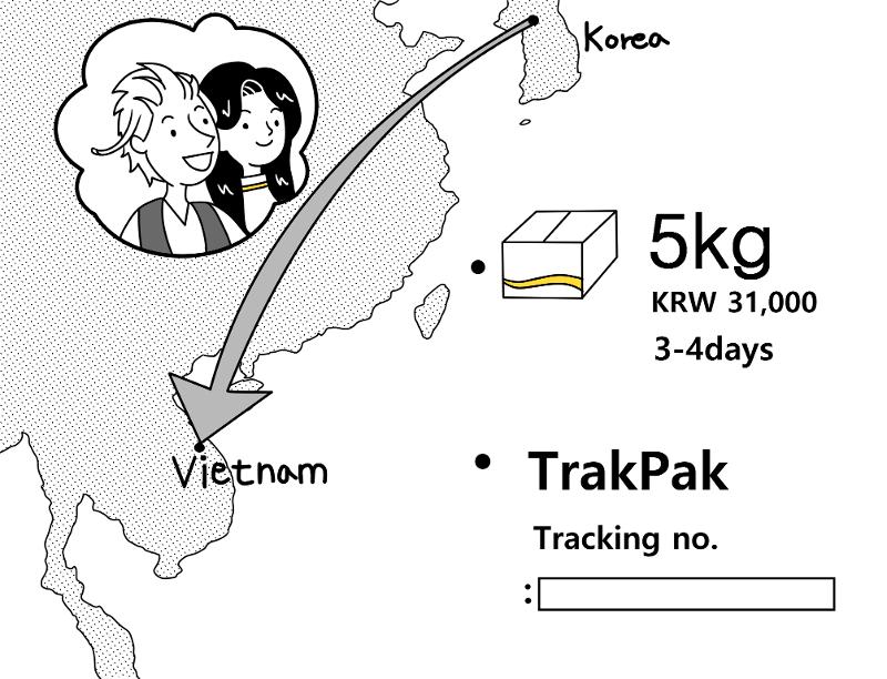 Su-hyeon: En realidad depende del país al que haces el envío, así como del peso del paquete. Por ejemplo, enviar un paquete de hasta 5 kg de peso a Vietnam te costaría alrededor de 31.000 wones, y tardaría entre 3 y 5 días en llegar. En la página web de Korea Post (https://ems.epost.go.kr/front.EmsDeliveryDelivery09.postal?langtype=en) puedes revisar todos los detalles. Nada más debes elegir el tipo de artículo, país de destino y peso, y te saldrá un estimado del costo y duración del envío.